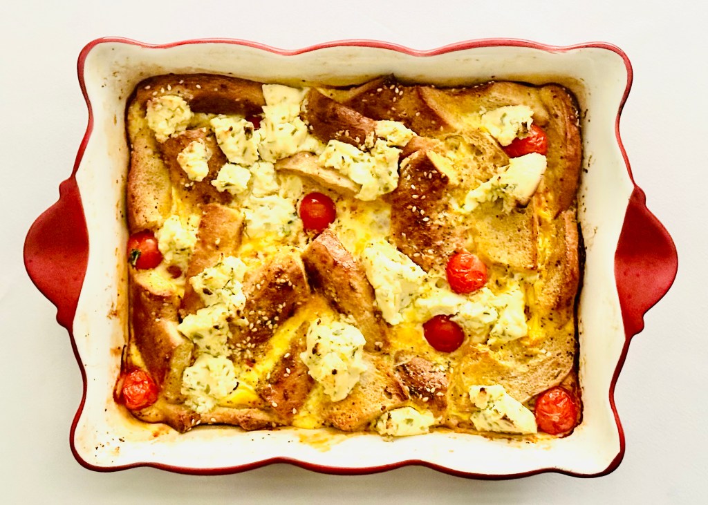 There’s something about everything bagels that make them so delicious and go with just about anything! They’re great toasted with a layer of cream cheese and make excellent breakfast sandwiches, but they truly stand out in this dish. Toasted pieces of everything bagel tossed with roasted tomatoes, fluffy eggs, and dotted with scallion cream cheese, this bagel bake is the stuff of lazy weekend mornings.